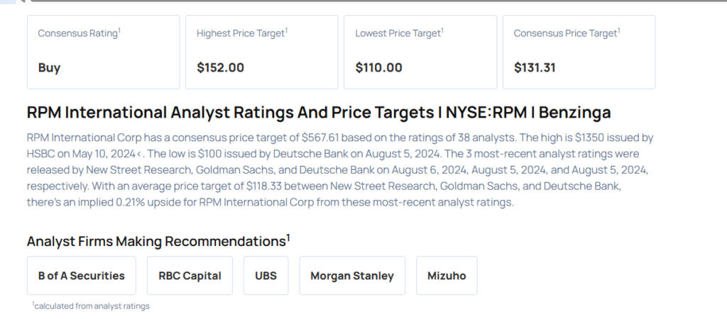 - B of A Securities analyst Steve Byrne upgraded RPM International (NYSE:RPM) from Neutral to Buy and boosted the price target from $126 to $129. RPM International shares closed at $111.57 on Monday. See how other analysts view this stock.