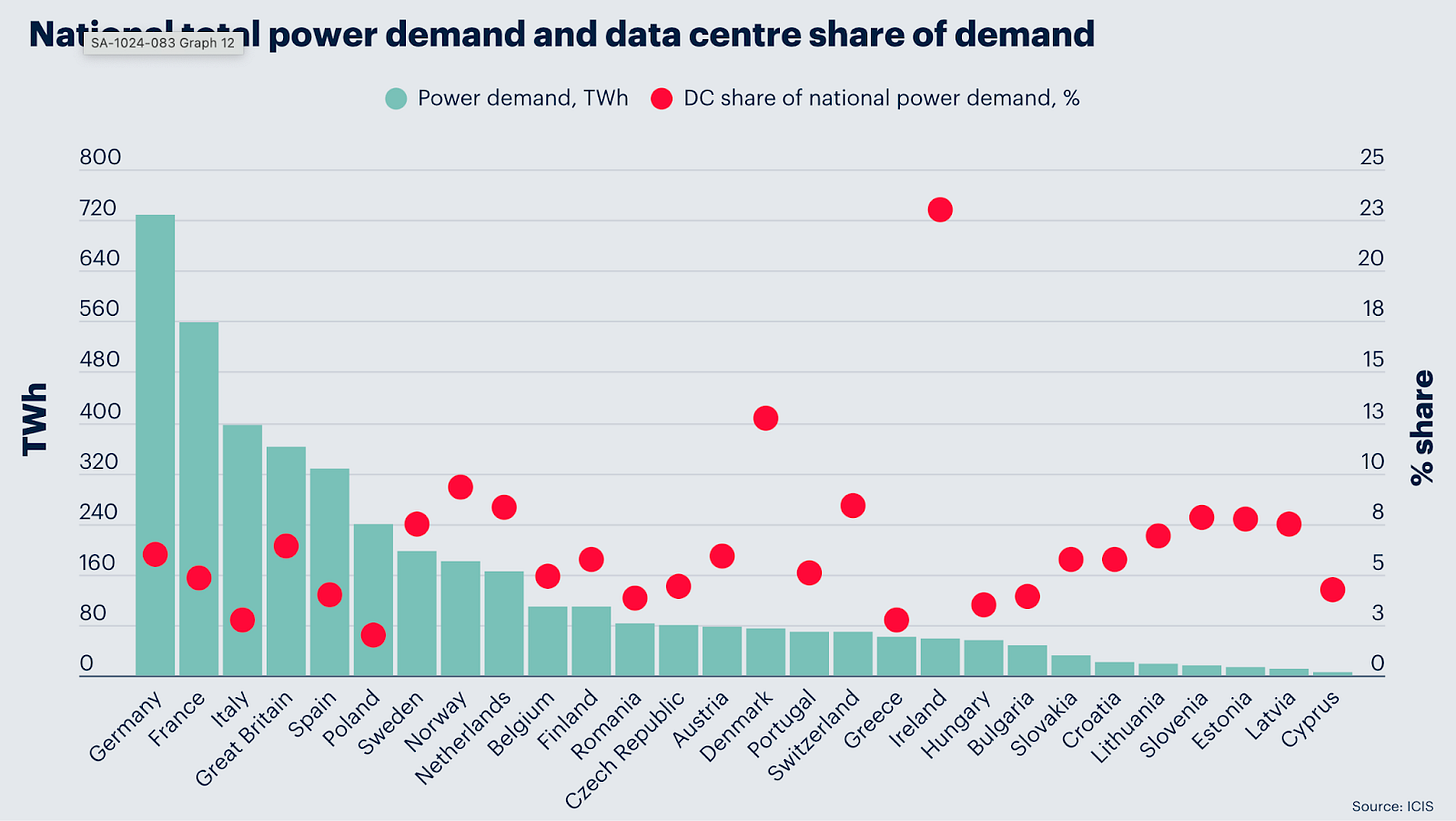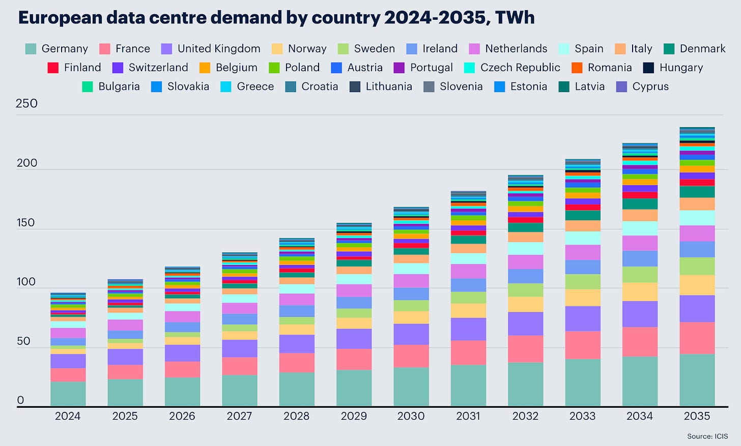 Europe's data center power demand will grow 2.7% to 5% of total electricity use between 2025 and 2030. By 2035, that demand in Europe will rise to 236TWh, the London-based Independent Commodity Intelligence Services (ICIS) has projected.