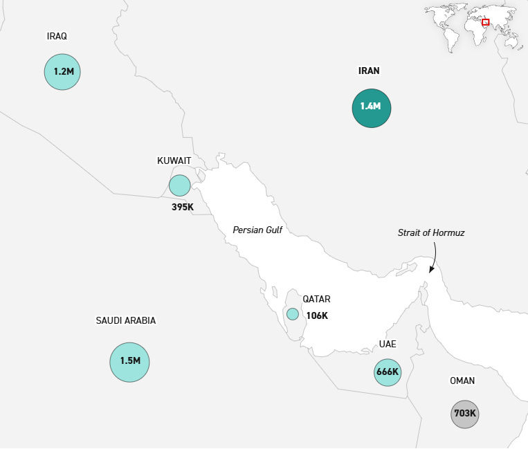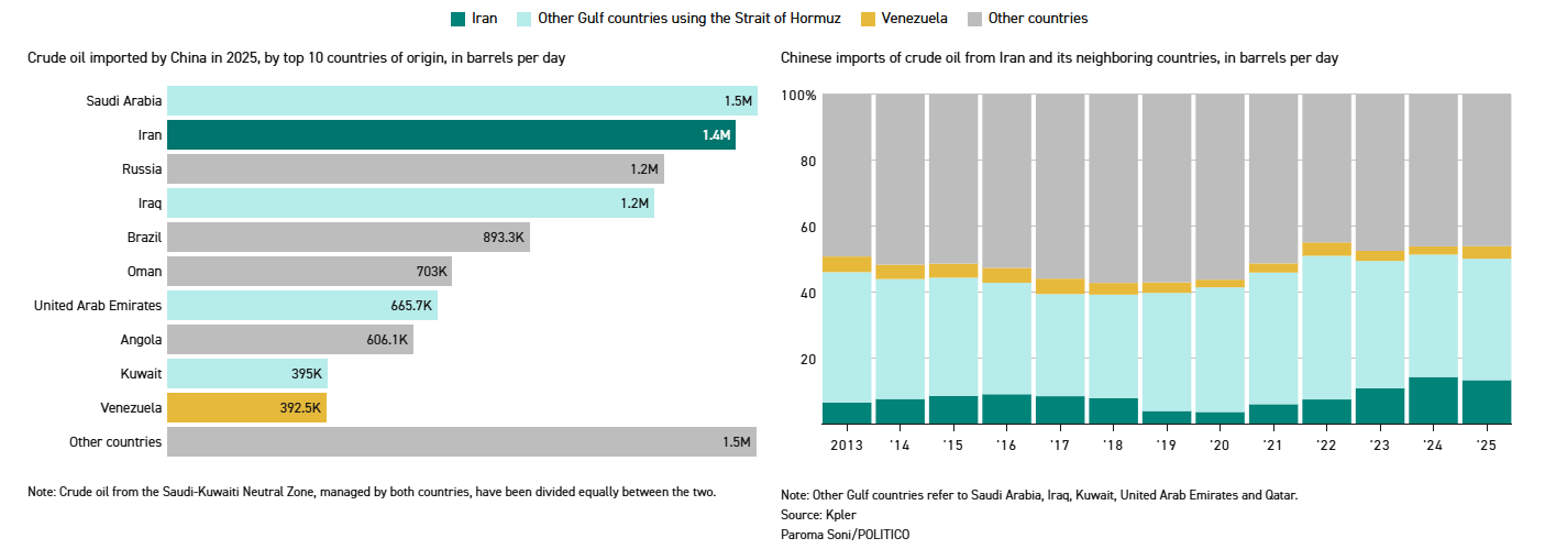 Over half of China's crude imports come from countries disrupted by the Strait of Hormuz conflict. China bought more than 80% of Iran's shipped oil in 2025, data from analytics firm Kpler showed.
