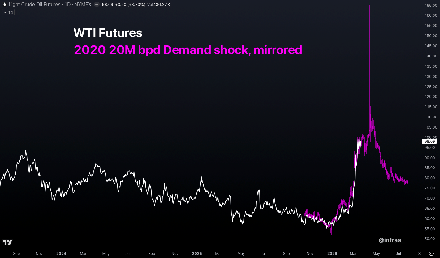 This current shock is almost identical magnitude as 2020, but reversed. Instead of a -23mln bpd negative demand shock, we're talking about a -20mln bpd supply shock.